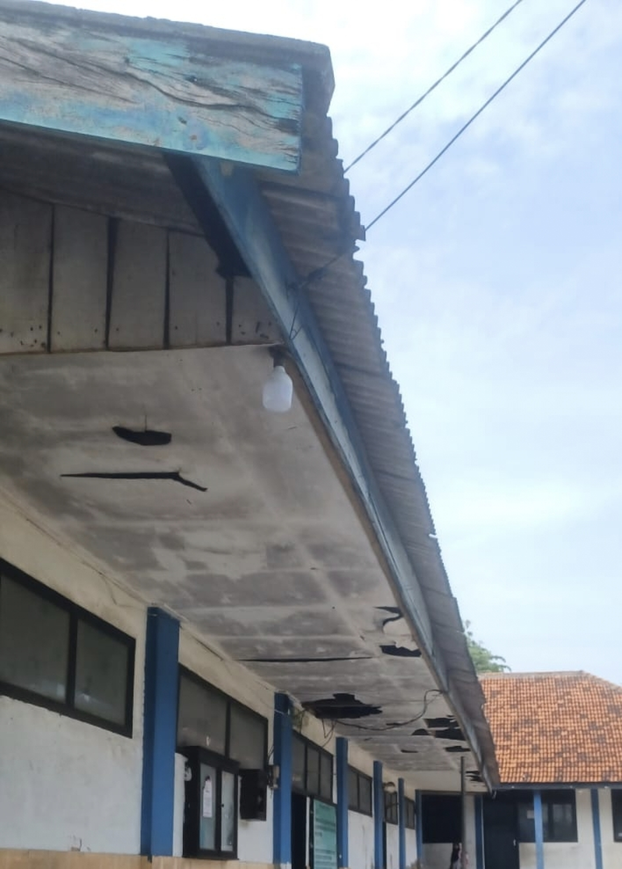 Ruang kelas terlihat kusam, dinding menghitam dan berjamur, serta plafon yang rusak parah hingga mengancam keselamatan siswa saat kegiatan belajar mengajar berlangsung.