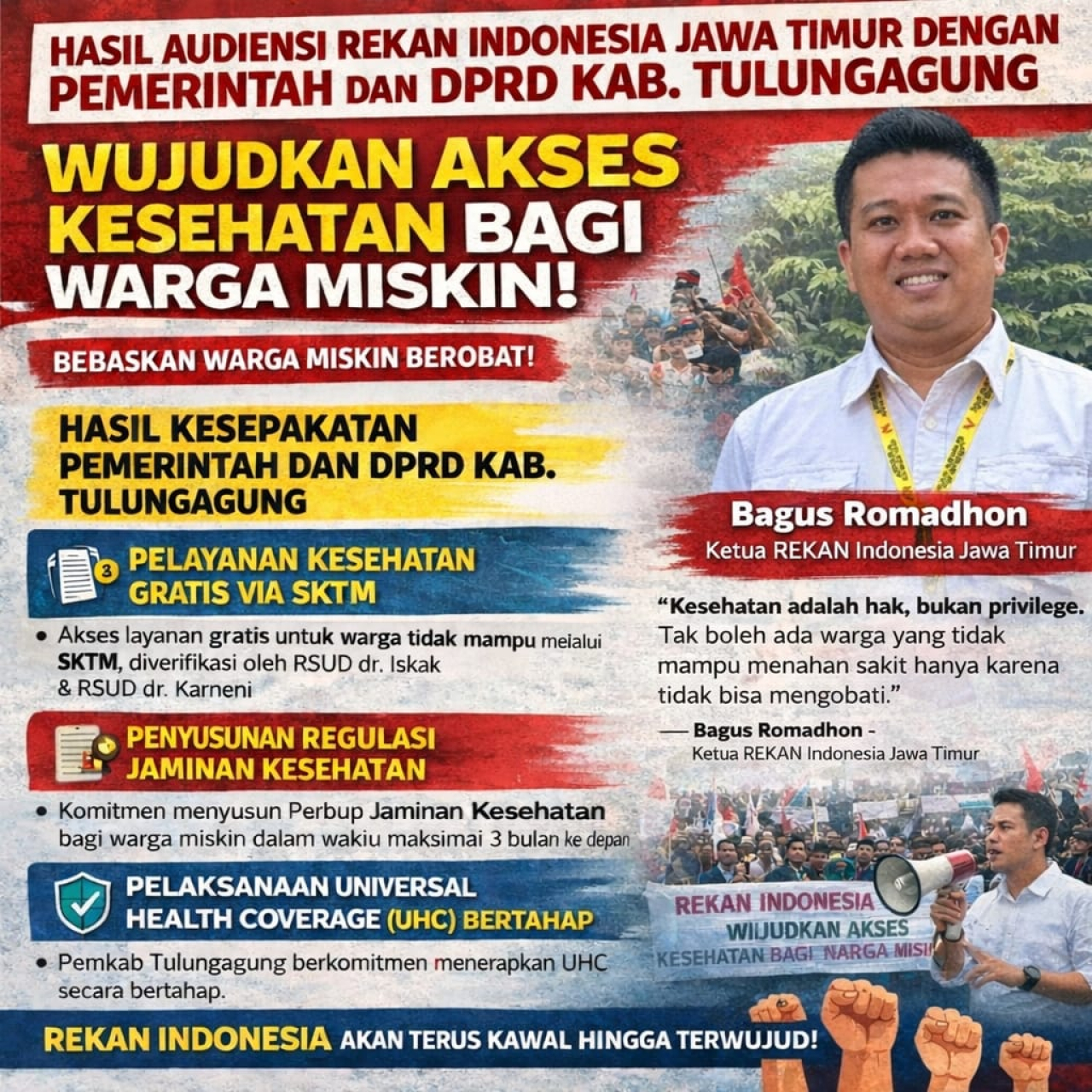 Ketua REKAN Indonesia Jawa Timur, Bagus Romadon, menegaskan bahwa akses kesehatan masih menjadi persoalan krusial yang membutuhkan langkah konkret dari pemerintah daerah.