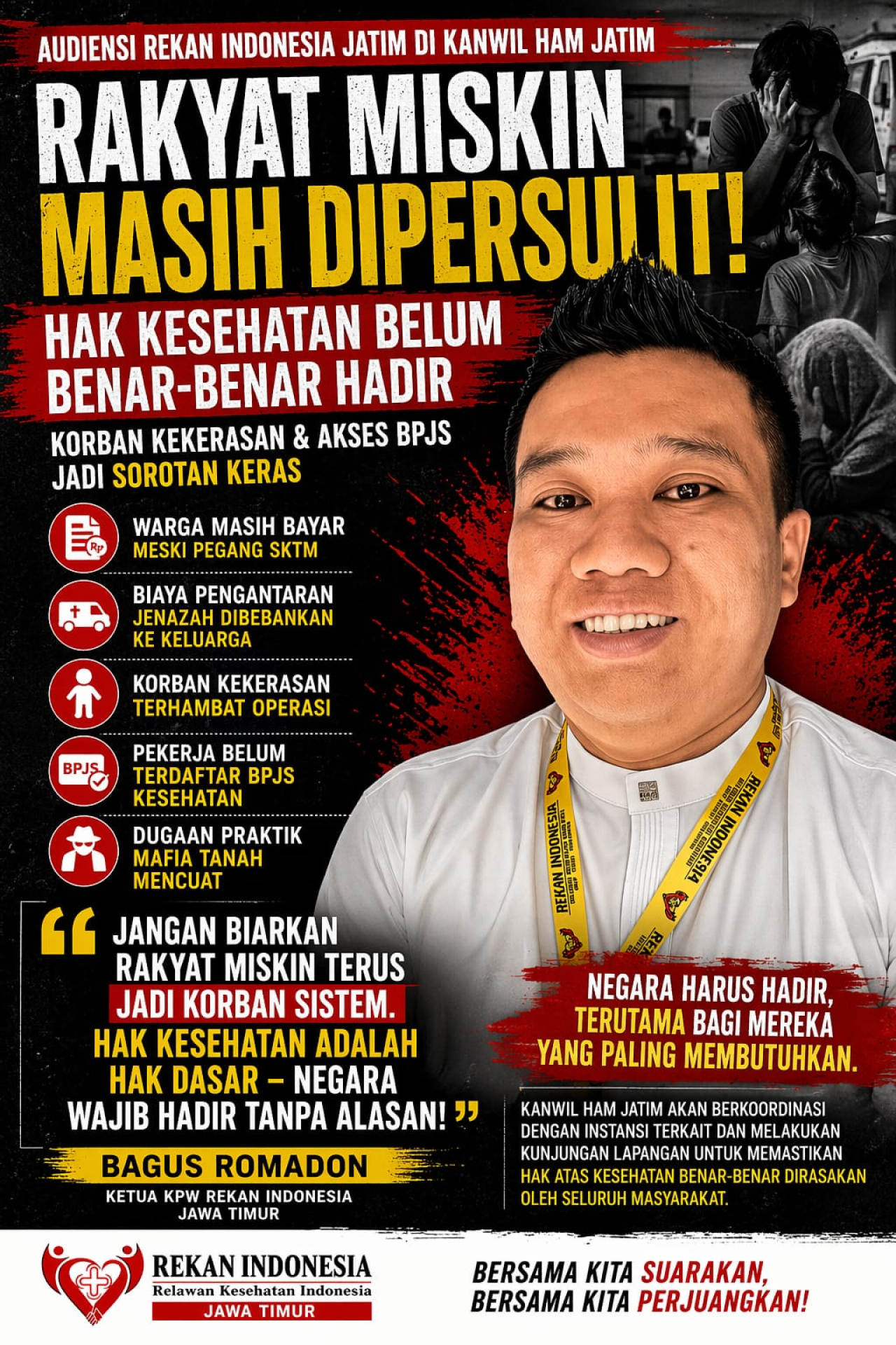 REKAN Indonesia Jawa Timur menegaskan bahwa: negara wajib hadir secara nyata dalam menjamin perlindungan korban, akses kesehatan, dan keadilan sosial bagi seluruh masyarakat.